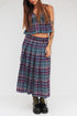 Uma midi xadrez com personalidade de sobra. A Plié mistura tons de roxo, azul e cinza de um jeito único — quase hipnótico. A modelagem é toda plissada, com movimento lindo e caimento impecável.