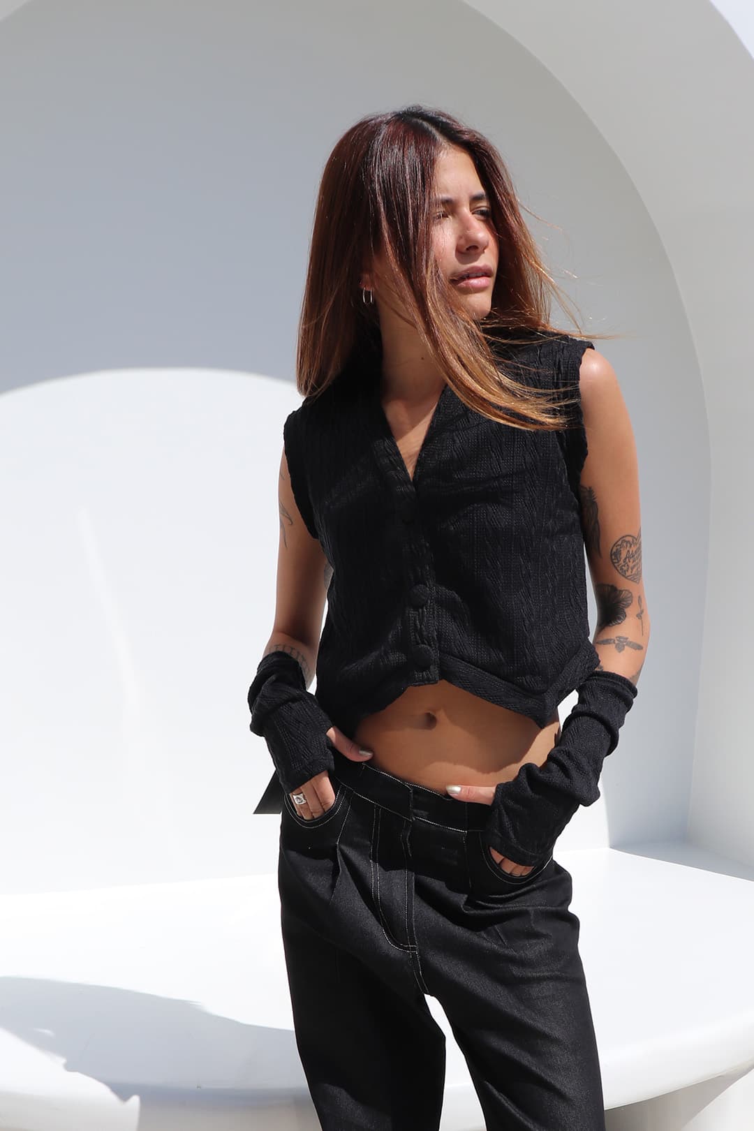 Uma característica marcante desse colete é a sua versatilidade. Você pode usar o colete aberto, como um item de sobreposição, para adicionar um toque de elegância ao seu visual.