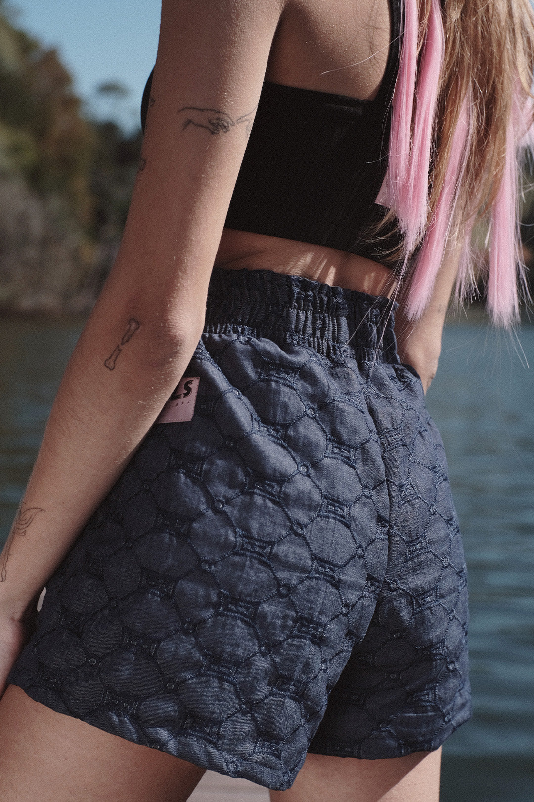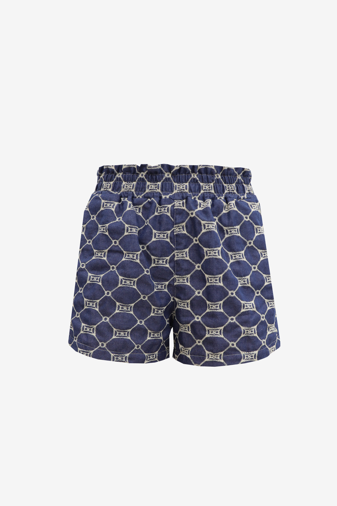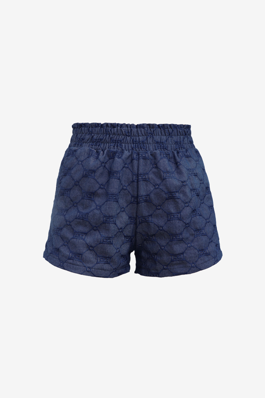 Confeccionado em tecido de algodão que simula a aparência do jeans, este shorts traz consigo durabilidade e conforto. Este shorts carrega bordados delicados na cor bege, adicionando harmonia e um toque de originalidade à peça.
