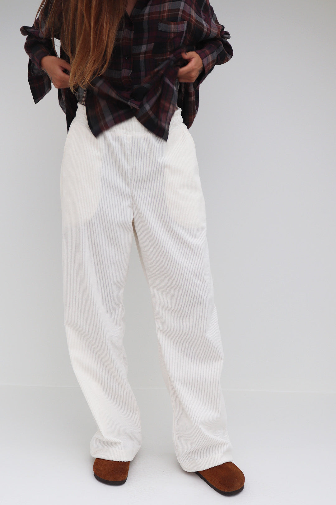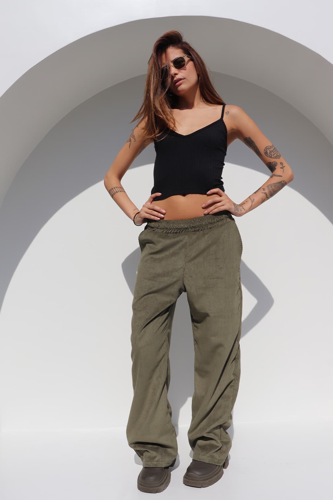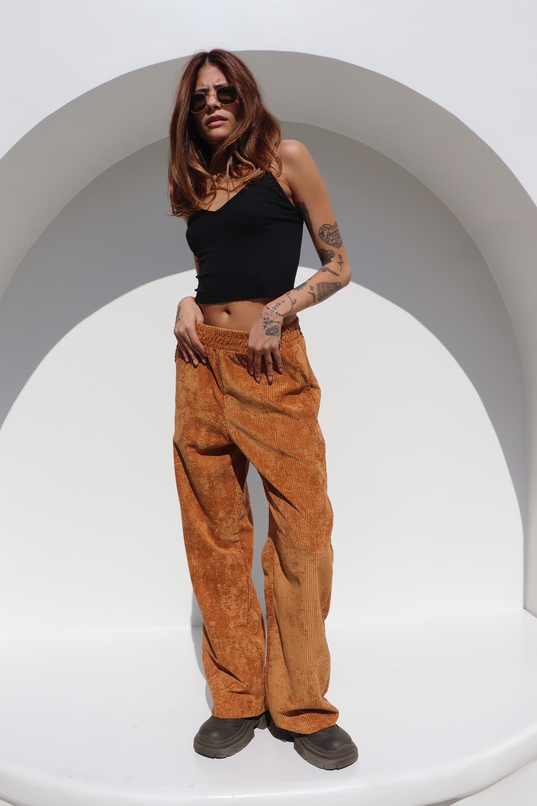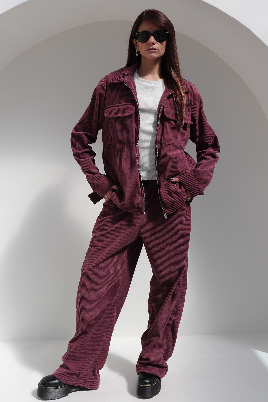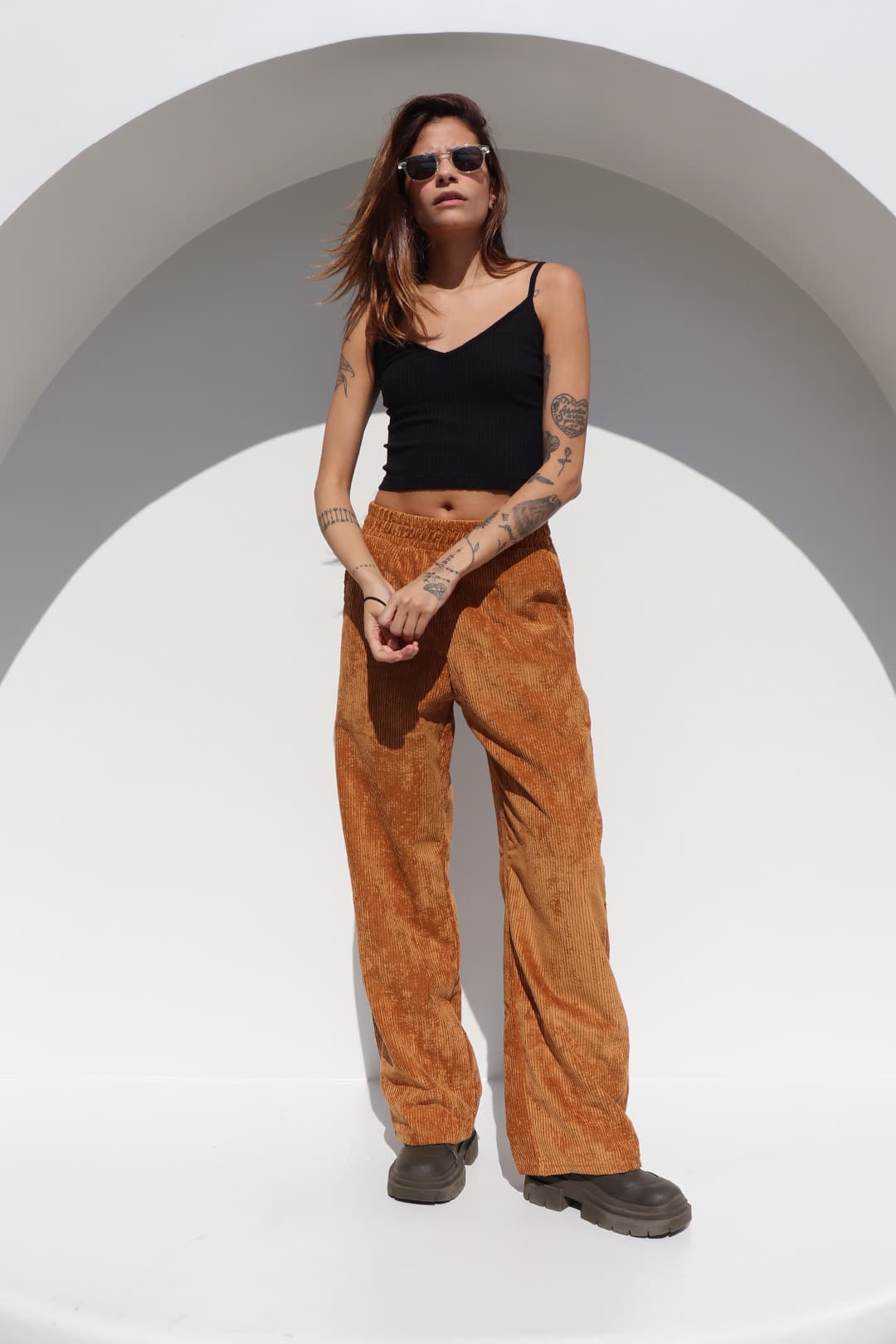 De veludo cotelê, com toque macio e caimento folgado, ela é comfy, mas com atitude.